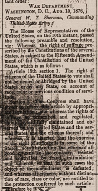 On the morning of August 16, 1876, the convention reconvened and was confronted with troubling news: an official directive from J. D. Cameron, Secretary of War, instructed General Sherman, commanding the army, to keep all troops not engaged in Western Indian campaigns prepared to support state authorities in defending citizens’ rights. It was widely understood that this order specifically targeted South Carolina. This development, combined with earlier correspondence between President Grant and Governor Chamberlain, made it clear that further federal military presence was imminent. The expectation was that additional troops would bolster the black Radical majority, which already surpassed 30,000, and reinforce federal and state influence, patronage, and control over the electoral machinery—factors stacked against the white population.