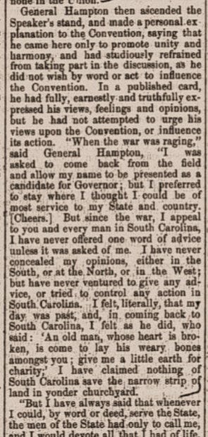 General Hampton’s acceptance speech was measured and brief, focusing little on prior events and actions. Instead, he emphasized the importance of peace, goodwill among the people, and the establishment of a just, efficient, and economical government. He pledged to serve as governor for all citizens if elected, promising a fair and faithful administration of the laws. Hampton’s remarks were crafted with his characteristic clear judgment, seeking to encourage resolute Democrats, reassure and appeal to black voters, and offer Northern Democrats a strong rebuttal to Republican claims that South Carolina’s white population aimed to persecute or harm black citizens.