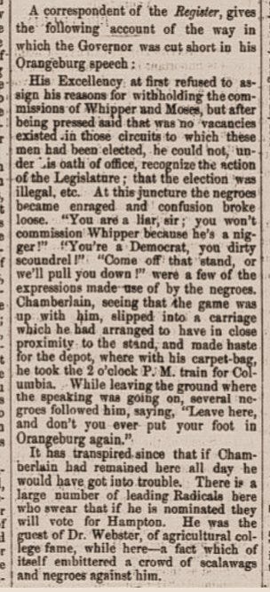 Even United States Senator John Patterson—often called “Honest John”—who had previously led a revolt against the governor and had exchanged public accusations of dishonesty and corruption with him, now swiftly aligned himself with Chamberlain. Chamberlain stood out as the only member of his party in South Carolina with a national reputation for decency, an asset desperately needed by the Republican Party, which was in a state of disarray nationwide. The party could not afford to be represented by another figure with a tarnished reputation, especially in a state that had become politically uncertain within just a month.