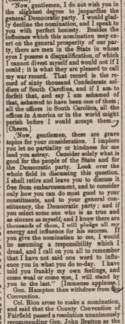 Mr. Rion of Winnsboro suggested General John Bratton of Fairfield, probably honoring instructions from his county, and Colonel T. W. Woodward, also of Fairfield, seconded the nomination. This gesture appeared to be largely ceremonial. Shortly thereafter, both General Bratton and Governor Manning withdrew their names from consideration. The convention renewed Hampton’s nomination, which was then unanimously affirmed, and proceeded to finalize the remainder of the state and other party tickets.