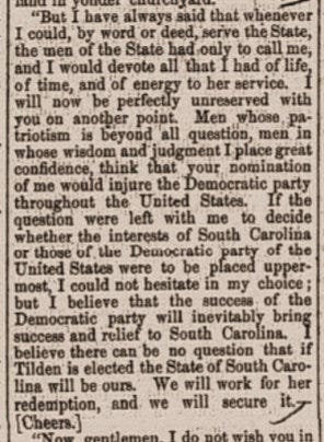 General Butler nominated Wade Hampton for governor, with Mr. Aldrich of Barnwell seconding the proposal. General Hampton delivered a carefully prepared speech of approximately seven hundred words. His candidacy had already been widely discussed and anticipated in the press for weeks prior. In his address, Hampton candidly expressed doubts about the wisdom of placing him at the head of the ticket, citing his record as a Confederate officer. Nevertheless, he pledged his full support to the campaign, offering to withdraw if another candidate seemed more likely to secure victory for the party and state.
